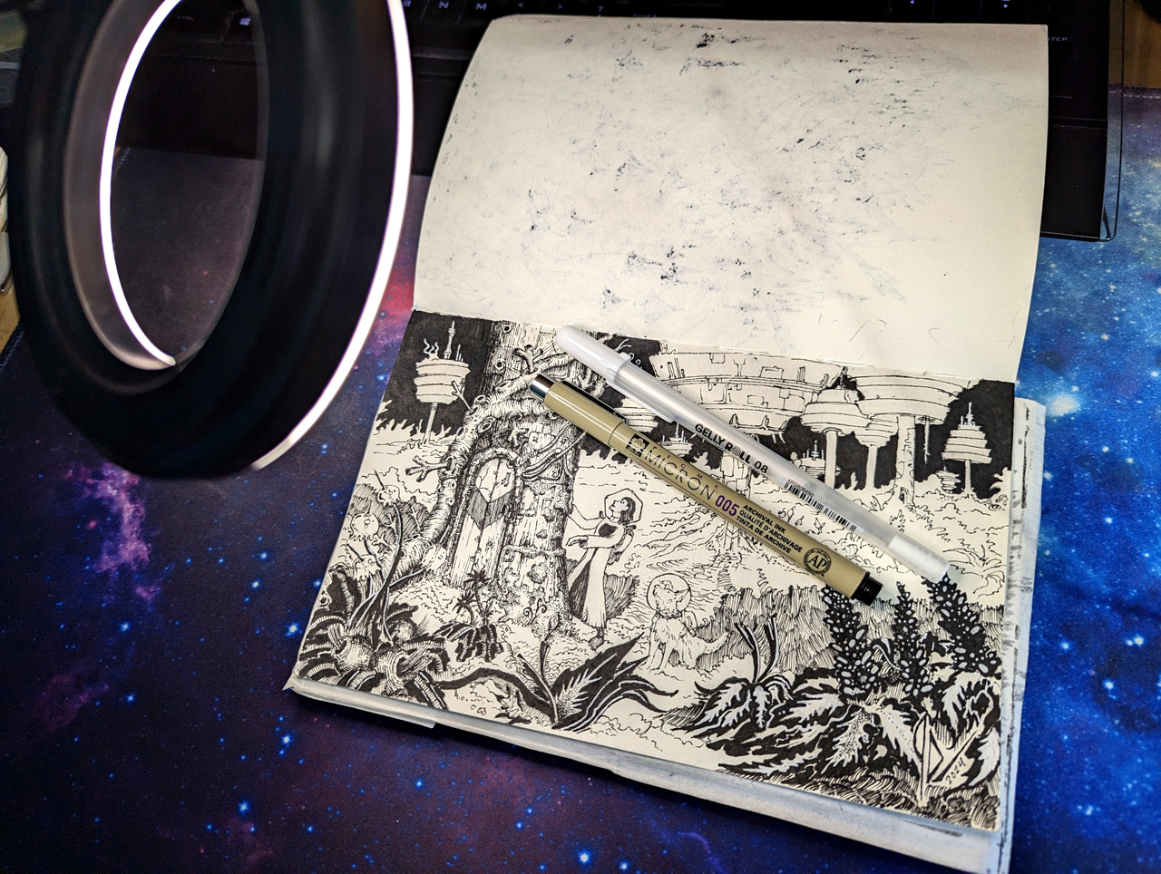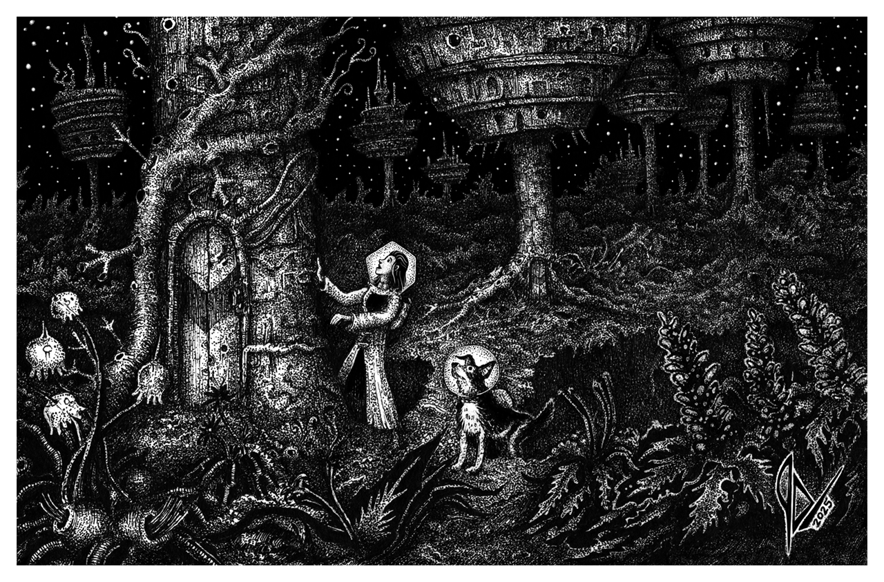 In March 2025, I reopened my sketchbook to that page and began reworking the illustration by overlaying some of my new stippling techniques. Between that and some minor digital paintovers in Photoshop for refinement of areas that couldn’t be fixed just by additional dots, I slowly worked back and forth between the traditional and digital to get the final image to a place I was finally happy with.