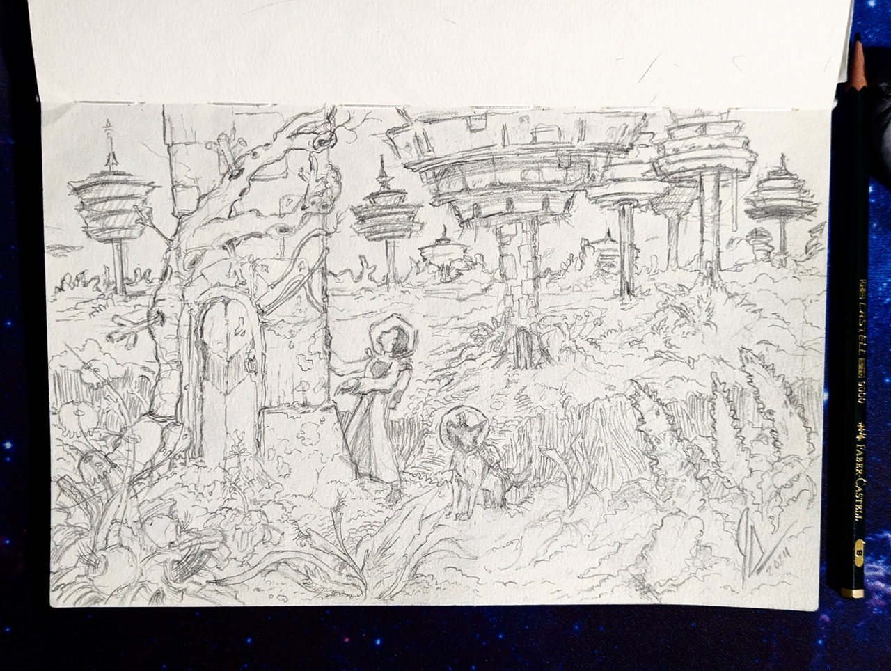 This was a piece I originally composed in my sketchbook in early 2024. Notably, some areas of this piece began my experiments with pointillism. I liked the general composition and storytelling, but it had significant issues with value contrasts, the sense of volume in the forms, it lacked any kind of atmospheric perspective, and the linework felt sketchy and rushed (particularly in the background imagery.