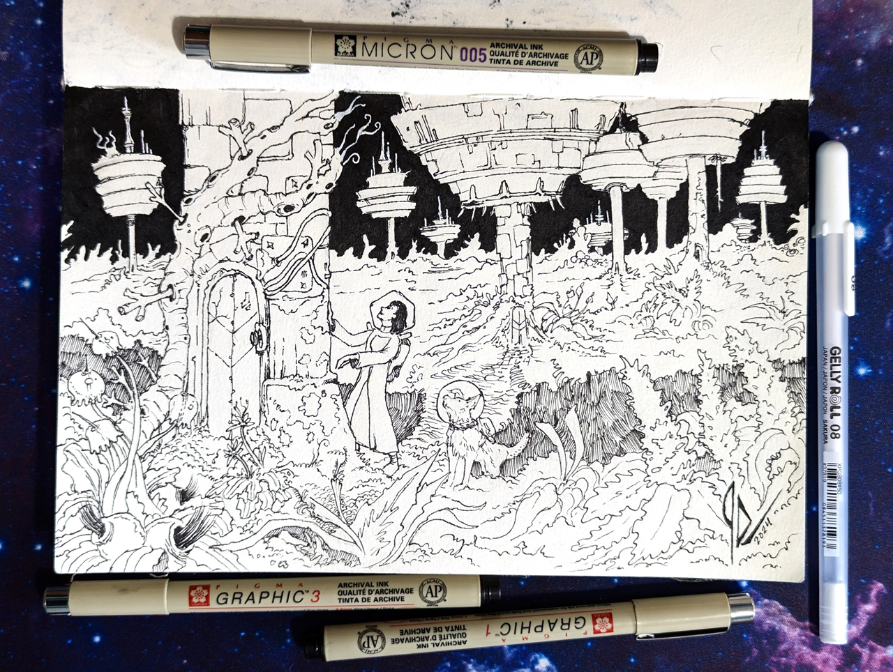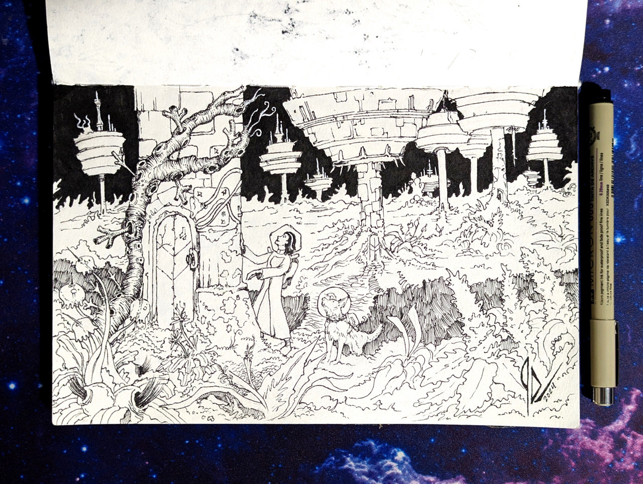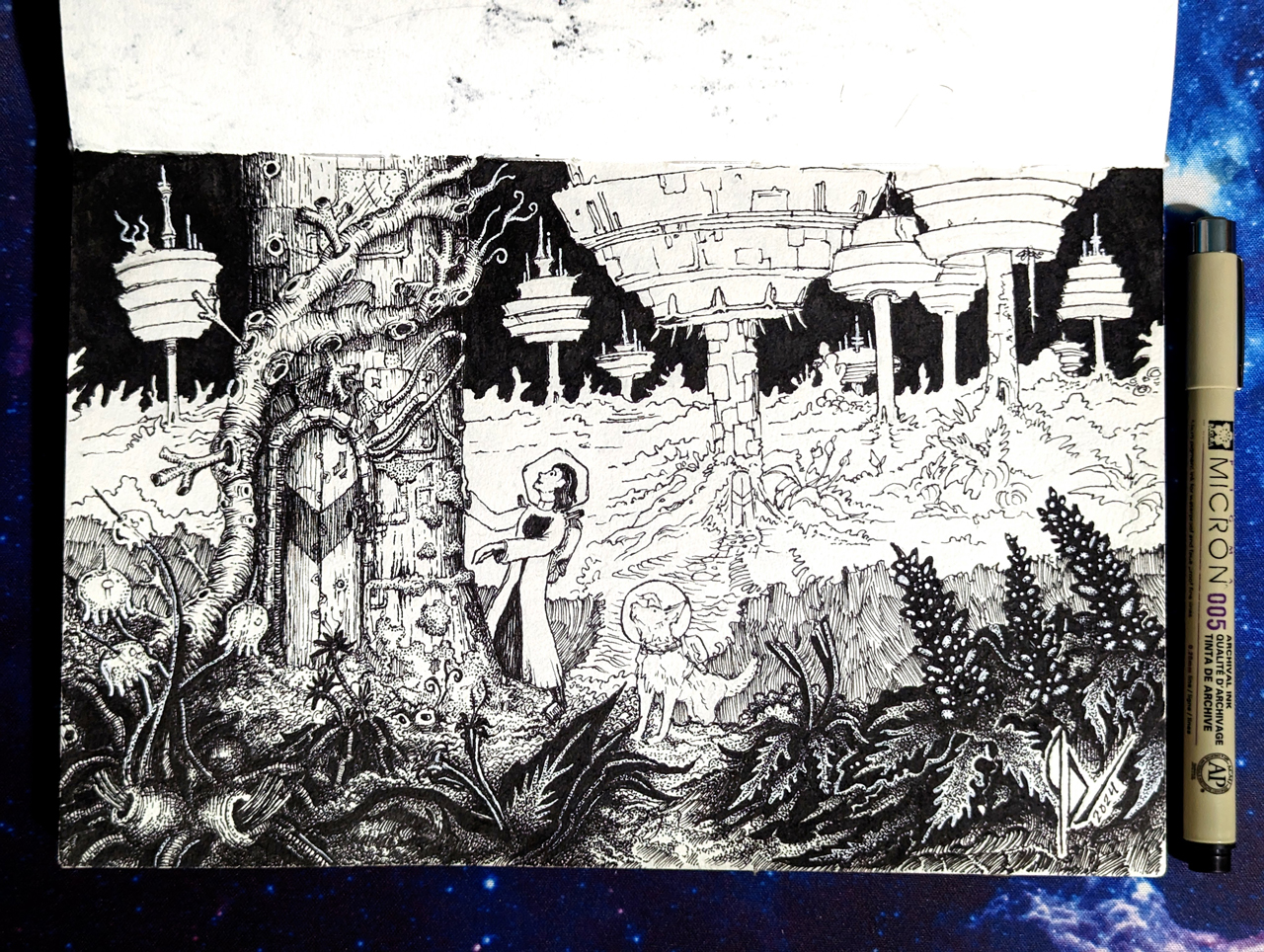 Lonely Universe follows the wanderings of young human Carmuke and their dog Tobee as they explore the rich, varied, ruined remains of a long defunct galaxy-wide robotic empire. Steeped my usual inky details and a hint of retro-futurism for flavor, each new locale is a stop on their solemn pilgrimage through the stars. Despite succumbing to their doom thousands of years prior, the bodies of the robot citizenry still remain. Frozen in place for eternity, they’re preserved in the pose of whatever they were doing when the kill signal spread across the galaxy and eventually reached them. An interstellar Pompeii. Superstition and fear prevents the scattered pockets of humanity from recolonizing the mechanized worlds, but some, like our curious protagonists, inevitably yearn to learn more of what came before…
