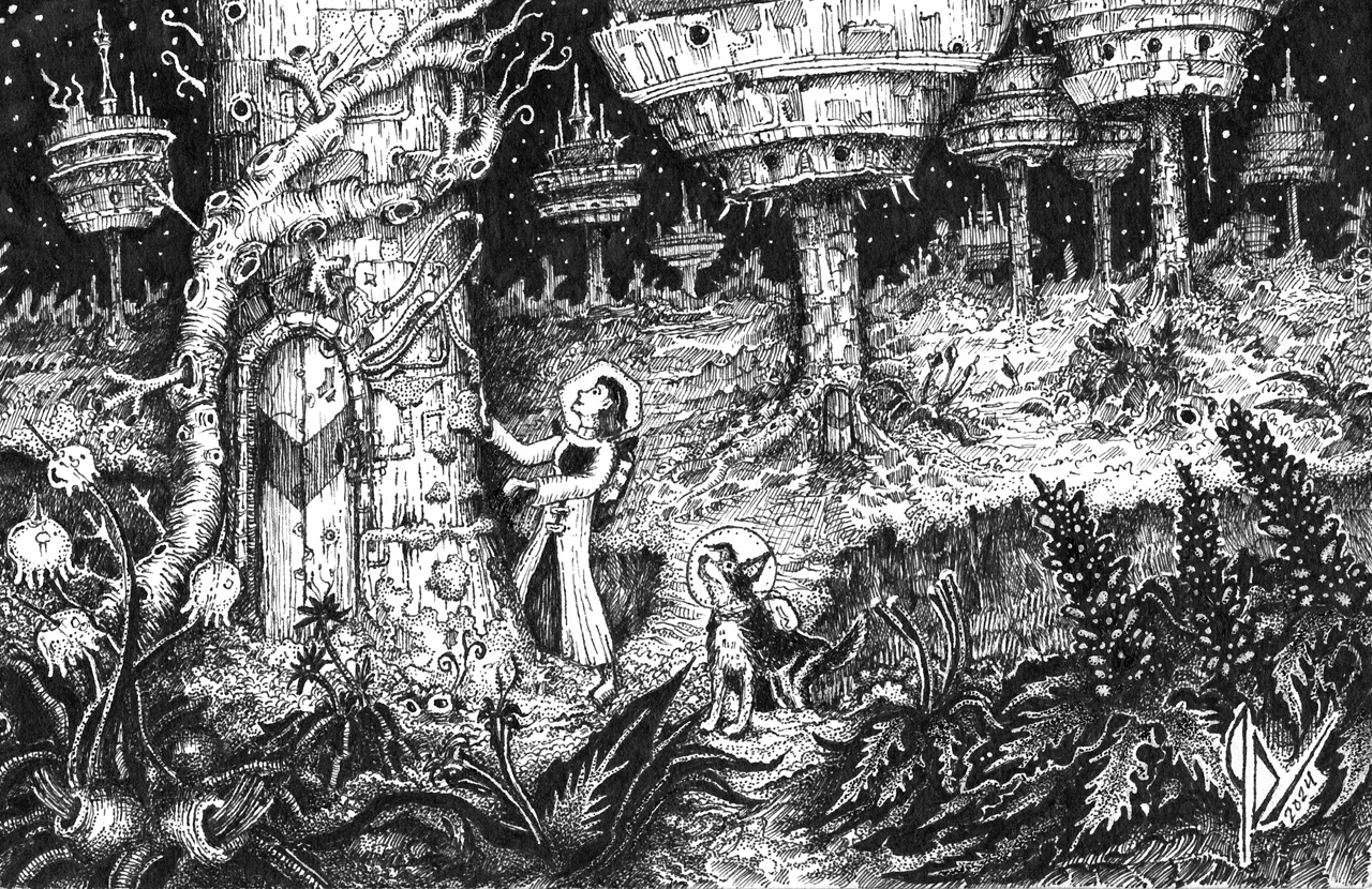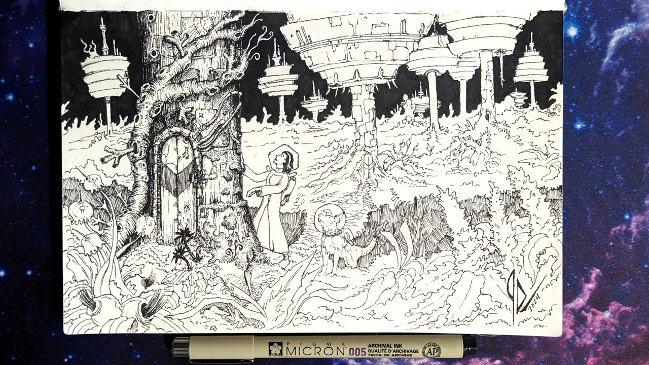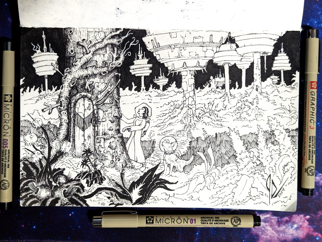 Lonely Universe follows the wanderings of young human Carmuke and their dog Tobee as they explore the rich, varied, ruined remains of a long defunct galaxy-wide robotic empire. Steeped my usual inky details and a hint of retro-futurism for flavor, each new locale is a stop on their solemn pilgrimage through the stars. Despite succumbing to their doom thousands of years prior, the bodies of the robot citizenry still remain. Frozen in place for eternity, they’re preserved in the pose of whatever they were doing when the kill signal spread across the galaxy and eventually reached them. An interstellar Pompeii. Superstition and fear prevents the scattered pockets of humanity from recolonizing the mechanized worlds, but some, like our curious protagonists, inevitably yearn to learn more of what came before…